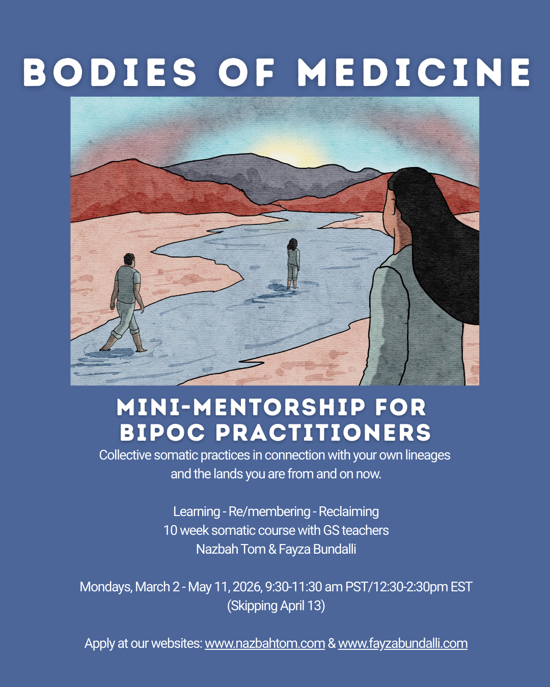 This 10 week mini-mentorship led by somatic teachers, practitioners and bodyworkers Nazbah Tom and Fayza Bundalli, moves through a 10 session arc of somatic practice designed to bring us back into relationship with ourselves, our lineages, the lands we're currently on and lands we come from.